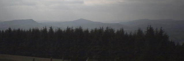 Hazy view over the forested flanks of Criag Syfyrddin - Skirrid left, Sugarloaf centre.