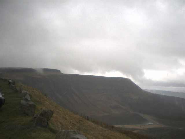 Craig Y Llyn is the name of the imposing bluff that looks north from the ridge at the head of the Rhondda valleys. A classically cloudy welsh day meant the photo doesn't do justice to this view - it really is a lovely mountain, its sheer cliff wrapping itself around the lake that gives the crag its name. The summit itself has no name of its own, and is in the forest just behind the bluff. I parked at a forestry pull-in on the main road just east of the top and was left with a fairly minimal climb to do - the only difficulty being the terrain, which was my "favourite"; ankle-turning tussock with occasional patches of deep bog. I'd been running for almost three hours on the mountains that same day before I got to Craig Y Llyn, so the high knee-lift you need to get over the tussock grass was challenge enough for me, and made me feel less guilty about having driven so near to the top. In fact, quite a few of the tops in my list of 40 summits could be ascended in a 4-wheel drive, as some roads and tracks in South Wales wind high up into the hills, but that really would be cheating.