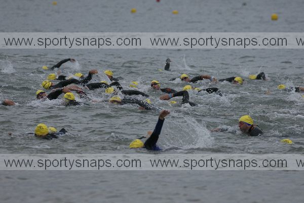 As start time approached, the 120 odd entrants rolled up and started to get bikes into transition - it was dull and with a light, slightly chilly breeze. Just as the briefing came around we started to get some drizzle, so it was a relief to get in to the water for the five minute warm up. And surprisingly warm that sea was too. The "3, 2, 1, GO!" caught a lot of us by surprise as we were still lining up, then I experienced for the first time the notorious congested start of a tri swim leg, with arms and feet coming at my face from all directions. Fortunately I kept my goggles on OK and settled into my own lane pretty quick.