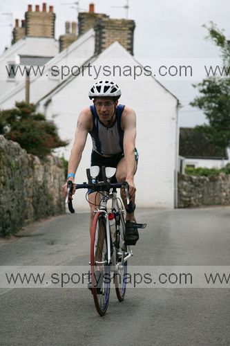 Thankfully, transition went really well - coming out of the water we were all cheered up the beach by the spectators which gave me a lift as I wrestled my arms out of the suit, jogging up a narrow boardwalk and into transition. Then the suit came off more easily than every before, and I was out of T1 in 1:04 - better than I'd hoped. The bike leg began with a steep climb out of Port Eynon, and I soon felt strong enough to overtake and start moving up the order. In fact, it carried on like that for the whole 25k. The course was beautiful and varied, taking us inland and over the moorland ridge of Cefn Bryn, then round in a loop through tiny farming villages and narrow lanes back to Port Eynon. There was lots of climbing, and I felt surprisingly good on the hills, coming out of the saddle and "attacking" (I now call it that having watched Le Tour on Eurosport) on the ascents. On the downhills I took it easy - there were sharp bends and single track roads to contend with, after a rainy night too, so I wasn't taking any chances. Fortunately, as I came back into the village after fifty odd minutes on the bike I hadn't been overtaken once, and I felt ready to go hard on the run.