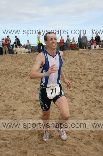 T2 was straightforward, and with running shoe on I headed out onto the sandy course. The run route was a little confusing, being two laps with a variation at the end of the second lap for the finish, and this was the only section where I could have done with better signs or marshals...that said I didn't take any wrong turns so all was well. After a short stretch of sandy lane we were on the boardwalk and running past the Culverhouse Hotel (highly recommended) and on to the dunes. Here there was a mix of boardwalk, soft sand and grass/heather pathways providing lots of changes of pace as tired legs struggled with the hills and turns. As usual this was my strongest part of the race, and I came to the finish 34th out of the 124 and feeling fantastic. It's a great finish line, running down on to the beach and back towards the sea.