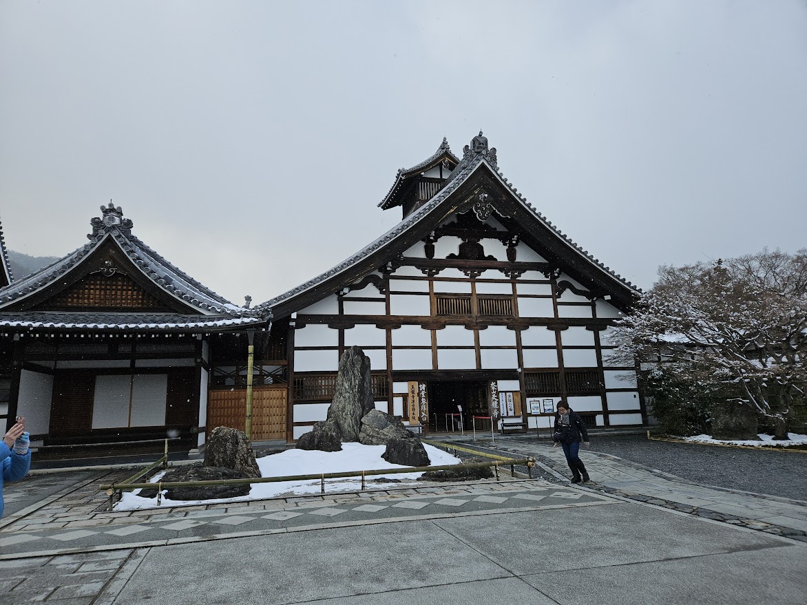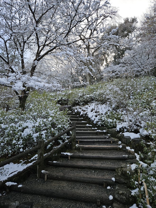 We made our way past the pond garden that dated back to the 14th century, and along walkways and steps at the fringes of the bamboo forest. The cherry trees would be amazing here in Spring, but we had them covered in snow instead of blossom - which I guess doesn't look too dissimilar.