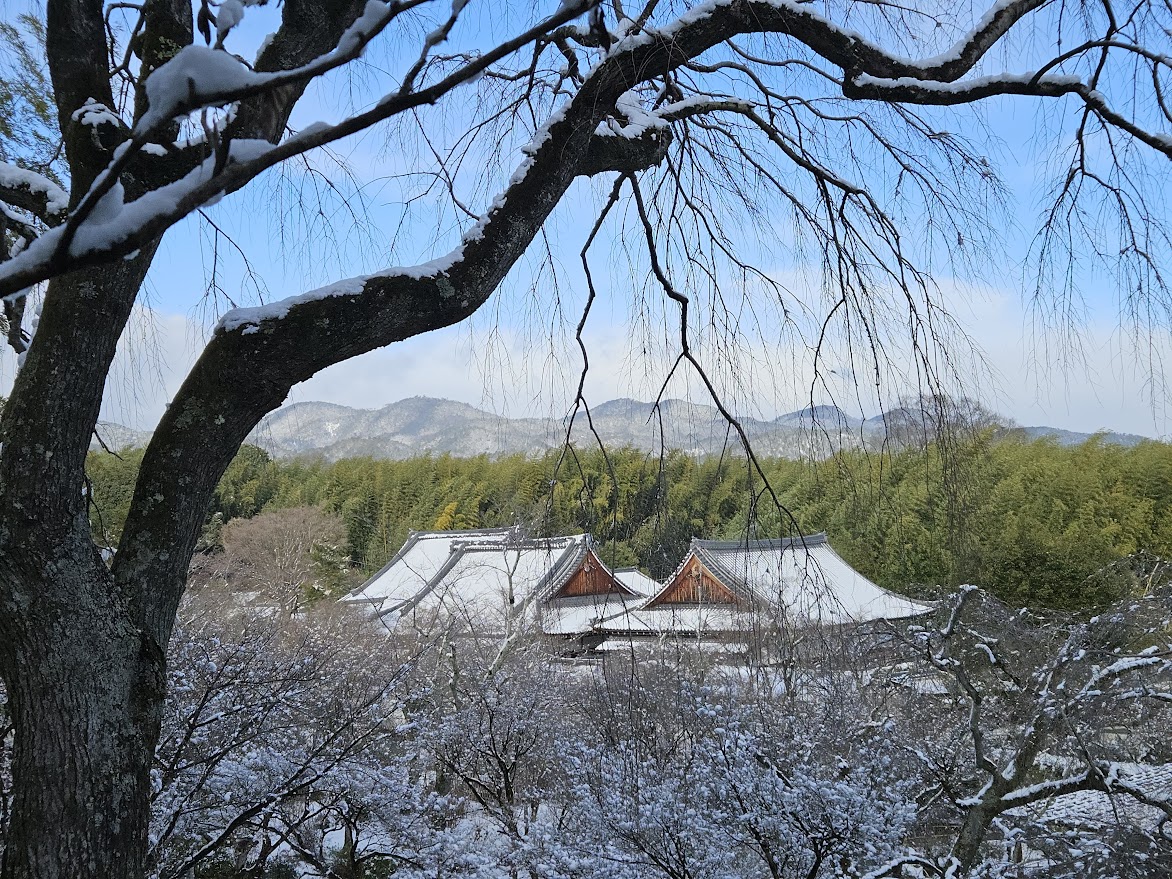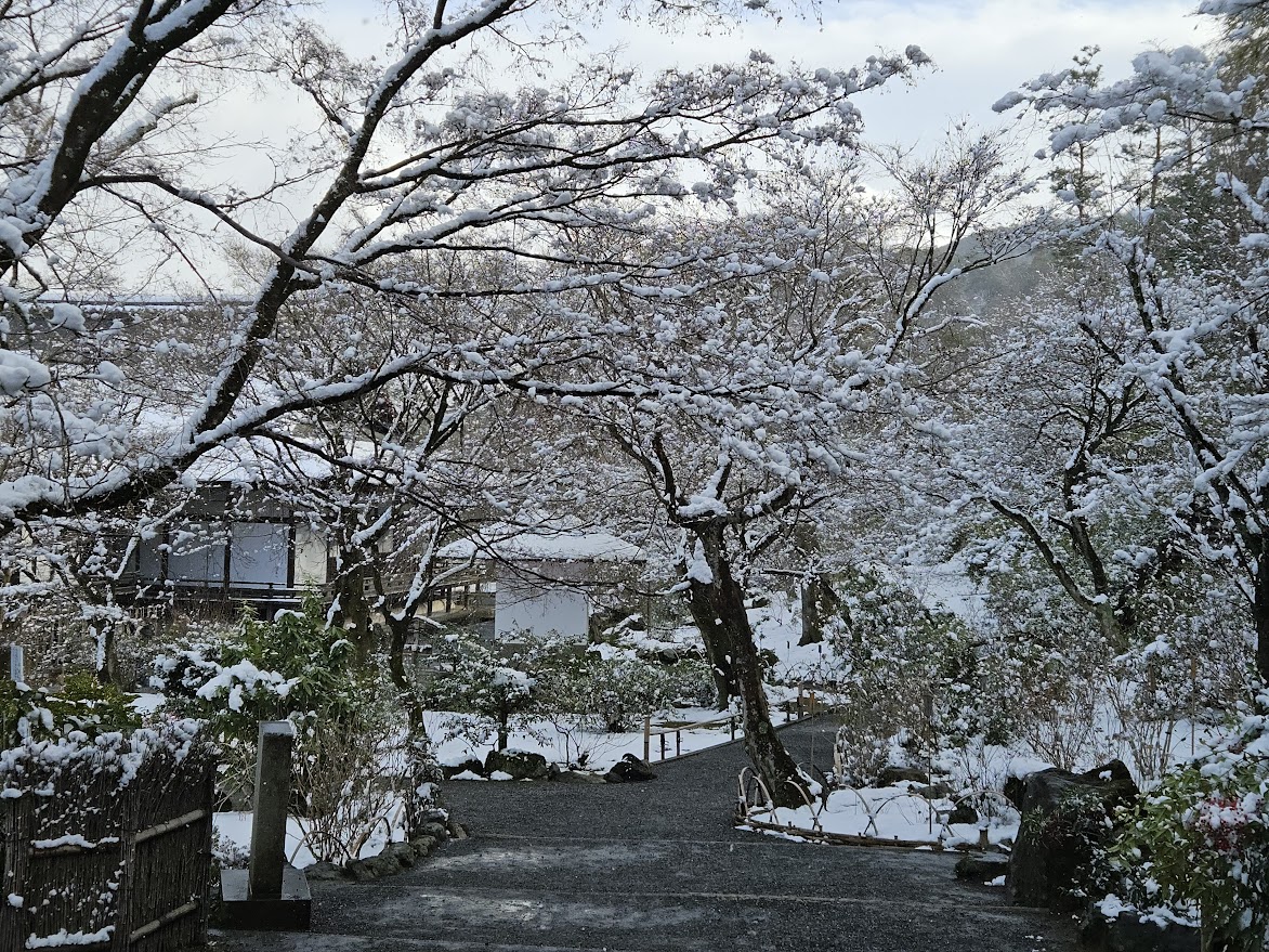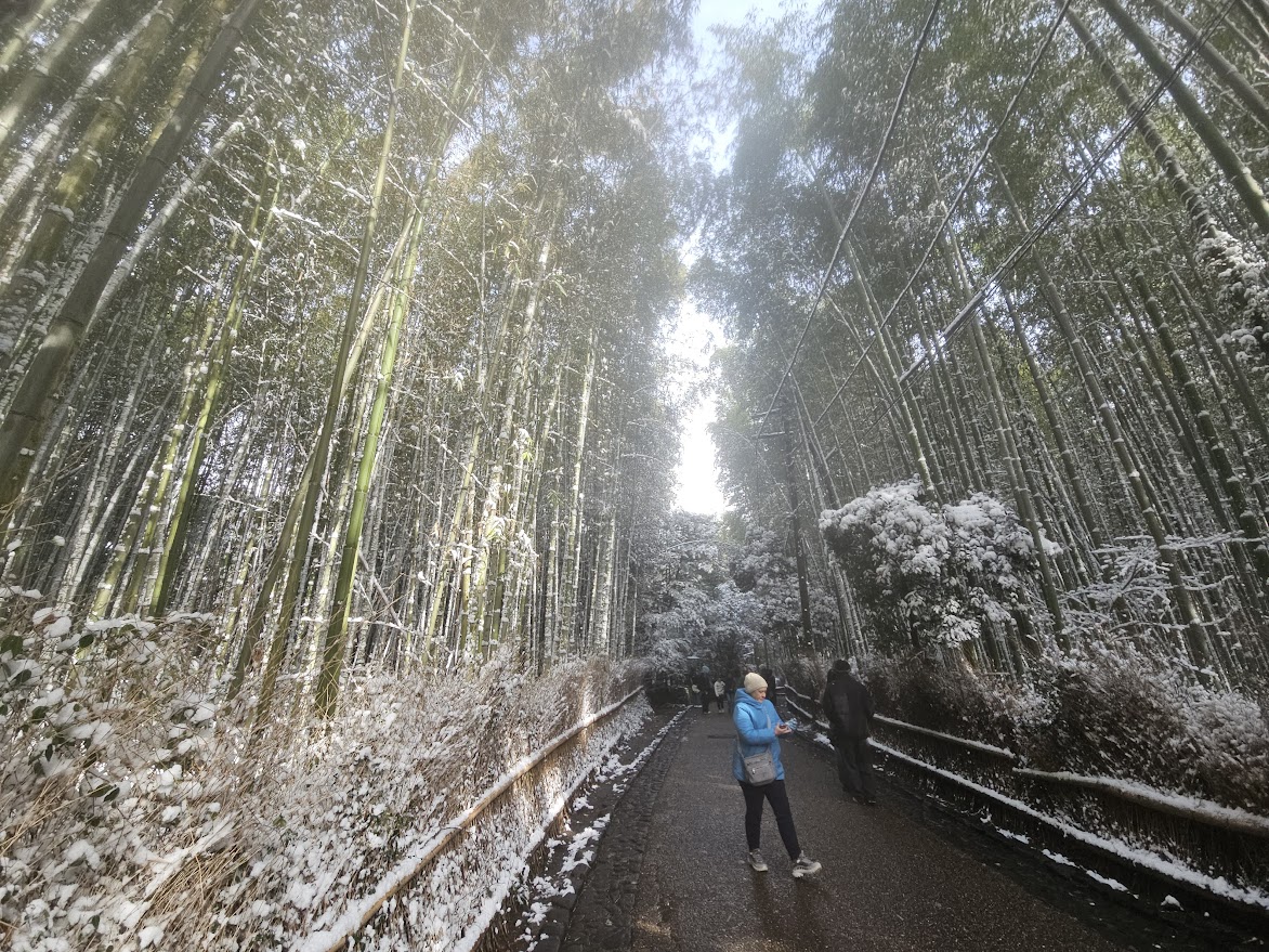 One of the main attractions in Kyoto apart from the temples and shrines (of which there are around 2000) is the landscape, especially the bamboo forest out on the edge of town at Arashiyama. The day Kokila and I had set aside for this trip was very cold - zero degrees - and with pretty incessant snowfall. A lot of our spiritual family, especially those not used to snow, opted to spend the day meditating but we wanted to see the bamboo groves with snow cover so off we went...
