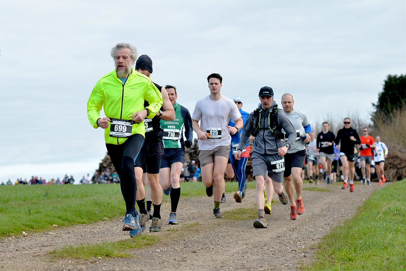 The weather forecast for race day had been pretty dire until a few days out, when it had suddenly promised a cool and dull day with maybe even some breaks of sunshine. Rolling down into the valley we had exactly what was promised, and I was layered up against the cold which I expected to last all morning. It wasn’t long before I found myself running almost alone as the field of 170-ish runners strung out, and I pulled off the buff and unzipped a bit as I warmed up. I was happy with the plan, happy with the pace and very happy with the scenery which unfolded around me (not to mention the perfect surface – firm but soft, nothing technical). From the first mile marker up to around 2.5 miles it was all steady uphill, but the reward was to emerge on to the Ridgeway, the 5000-year old drove that many call Britain’s oldest road. If you ignore the sweet track (a line of planks through the marshes of Avalon) I reckon it must be the oldest one that you can still follow. The sun was bright, I was serenaded by skylarks, I was running alone with just a couple of faster runners visible up ahead but otherwise just the natural sounds of the Wessex Downs and a sense of timelessness. The light had that clear quality you get in Spring, with views from the ridge out over the rolling hills and valleys of this corner of Wiltshire.