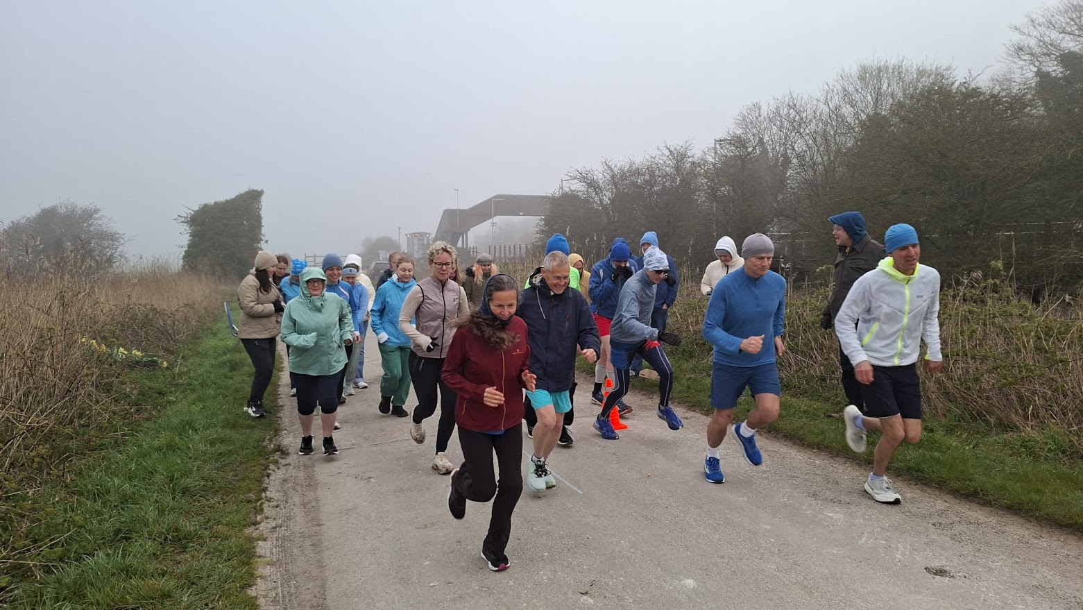 After Mridanga had intoned the race prayer (on inner running and outer running) and we'd repeated it together, there was a brief silence then the release of stored-up energy as we all leant forward into a run and set off. I'd settled myself a little way back this time, but soon caught up and slotted into second place behind the excellent Mahasatya, visiting from Switzerland. He was in good shape and soon putting some distance between us as we rounded the bend and started to cross the flat valley floor, the flood plain of the Ouse. There should have been a lovely vista out over the valley floor to the slopes opposite and the village of Southease with its prominent church. Thanks to the mist, we could barely see as far as the rather sketchy bridge over the river. There was a bit of a climb up and over that bridge then more flat out across the valley towards the village. As we approached the bend leading to the turnaround I could still see Mahasatya now way up ahead, and glancing left I lost myself briefly in a scene that was straight out of a constable painting - weeping willows hanging low in the haze over a green lake, a soporific sight in the early morning calm. Then came the climb up to the ever-present turnaround marshal, Tejvan, wrapped in layers against the cold and stationed at a hi-viz cone which I rounded having covered the half mile in 3.48. Mmmm - I was not quite running flat out, but still that was pretty slow. Of course my main aim was to run the race and finish without having tightened up too much or aggravated my right calf, which these days is the area I have to protect, but still I was keen to get at least close to 14 minutes. That was going to be a trial.