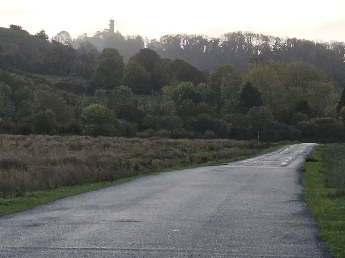 Under lightening skies I came into Thornbury on some back lanes, skirting round the town with views of the magnificent church and the entrance to the castle before having to backtrack a bit to find the right route up towards the A38. More lanes and silent roads lead to Cutts Heath and a descent through glorious woodlands, deserted but for a couple of horse riders, before a climb back up towards Cromhall. I was in familiar territory, out to Wickwar and down on to Inglestone Common where the sun was just coming up over the Cotswold Edge behind the Somerset Tower.