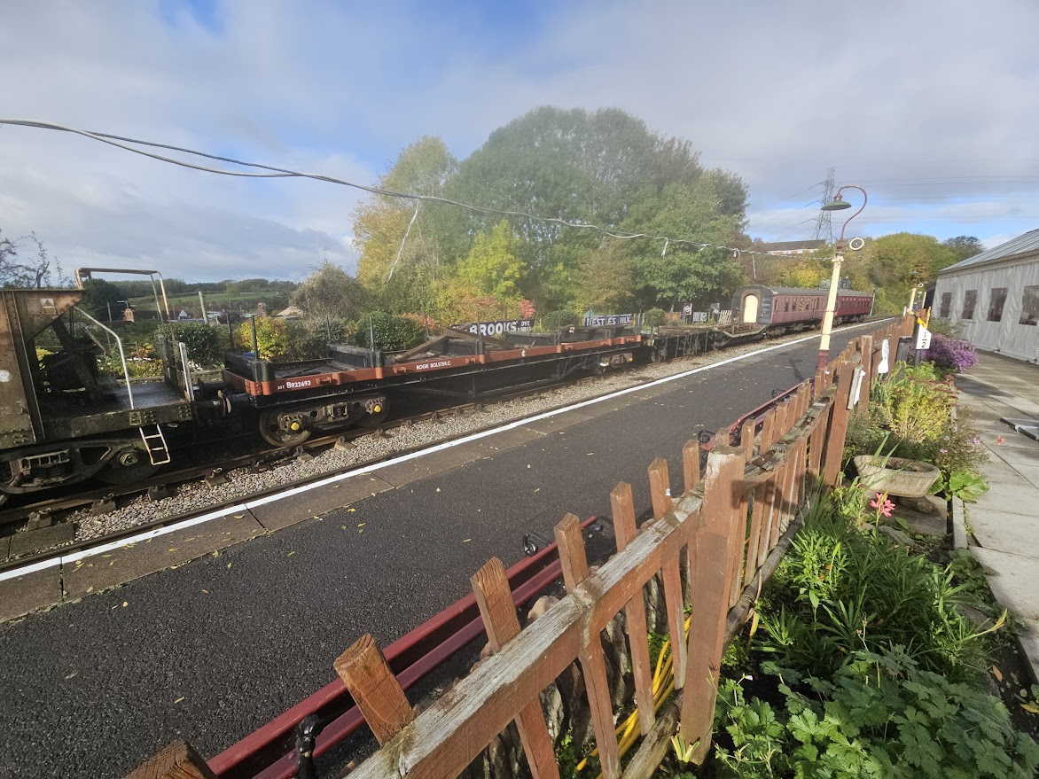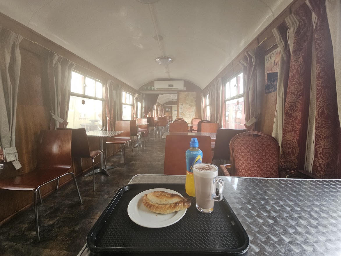 Once across the common an unexpected shower made me stop to hurriedly pull on my race cape and then I was heading for the testing hill at Hawkesbury, only to find that I had totally misremembered the Cycleway route which doesn't include that hill. Instead I took a right (with GPS restored now, for some reason) through Horton and over the vast, open common at Sodbury. After that came a long, fast section on Mapleridge Lane to loop me back towards home, an intricate route on lanes around Engine Common and Frampton Cotterell eventually spilling me out on the Ring Road Cycle Path. The cycleway led towards Bristol briefly, a few runners and the odd cyclist now starting to appear, then at Old Mangotsfield Station, a ghostly cathedral of stone on its deserted triangle of platforms, I u-turned and began to make good time towards Bath. When I finally began to pass the old cranes and wagons of the Avon Valley Railway, then roll into Bitton Station for a break, I had clocked up 47 miles which I guessed was around half way. The cafe here has seating in an old railway carriage - very atmospheric! I was on course for my 7 hour target after a quick break to down a hot pastie & large hot chocolate - I also refilled my single bottle with lucozade as I never drink enough on these rides, especially in the cold.