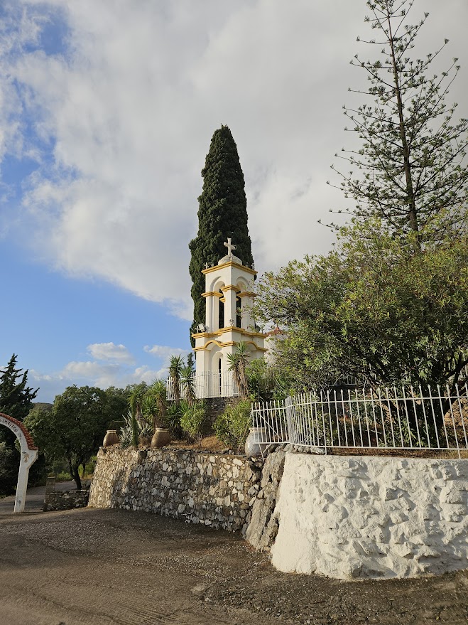 A couple of days after my Profitis Ilias run and with my achilles feeling a little sore, I opted for a flatter session on a route I had found online leading deep into the interior of Rhodes towards an abandoned (but apparently, devotedly maintained) monastery on a hilltop near Masari. It had rained heavily in the previous 36 hours and I had a feeling I might have to wade the ford on the way out of Haraki (as I had done the day before on a short morning run) but when I got there it was easy enough to avoid the standing water. People had helpfully left some pallets on the road as stepping stones.