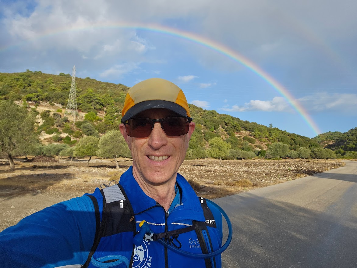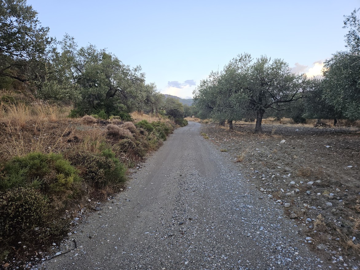 I felt a few drops of rain as I began the return journey, but before I could even get my jacket on it had turned into a heavy downpour. This was only a siight hassle, as I had decent gear with me and it wasn't particularly cold or windy. The payoff though was the vivid rainbow that appeared to the north west. Single at first, partial, then fully across the sky and then finally a double-rainbow. It stayed with me all the way back to the highway on the same route I had taken on the way north, through the wide but river-less valley and on the gravel-roads flanked by olive trees and lemon groves.