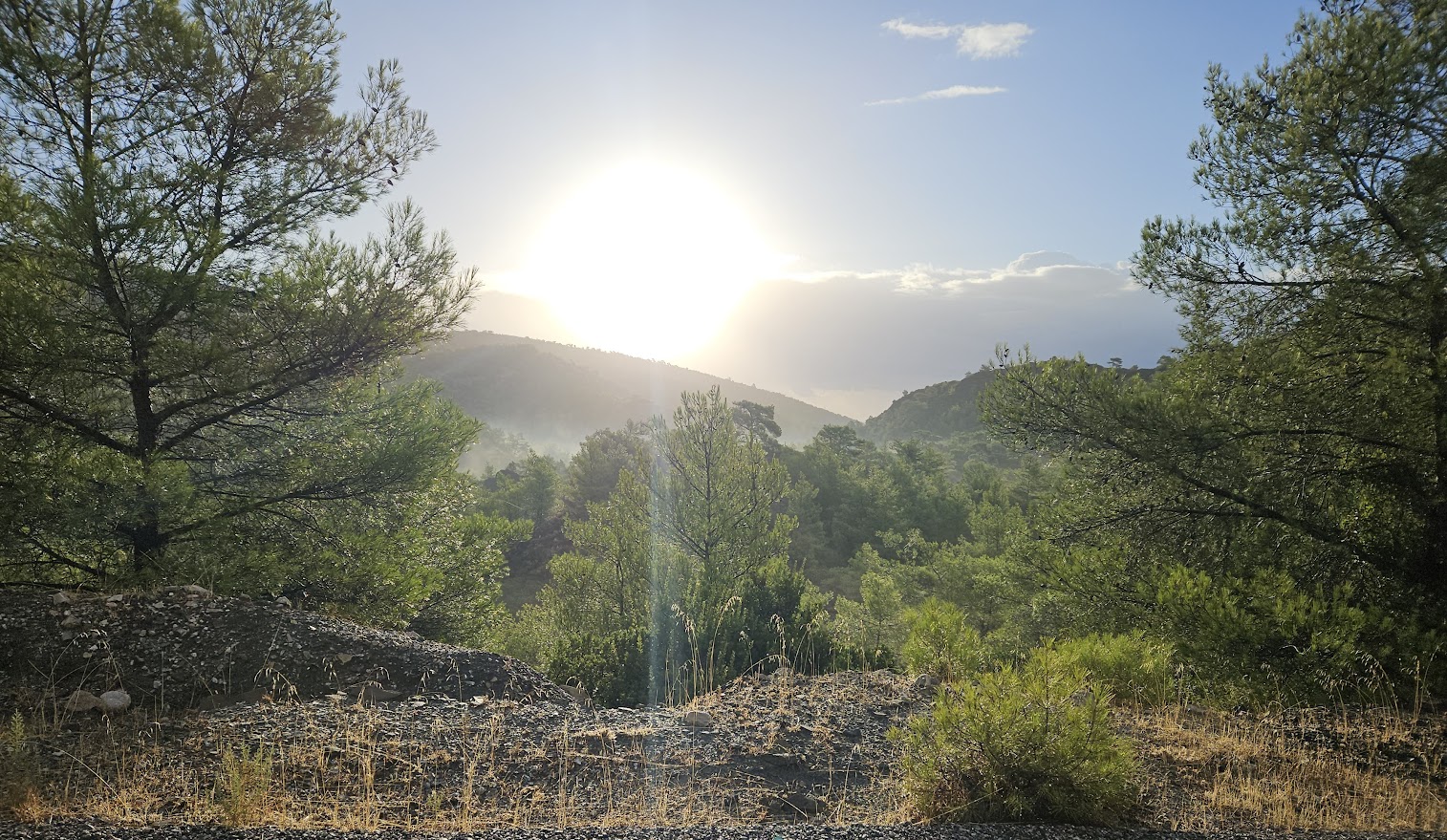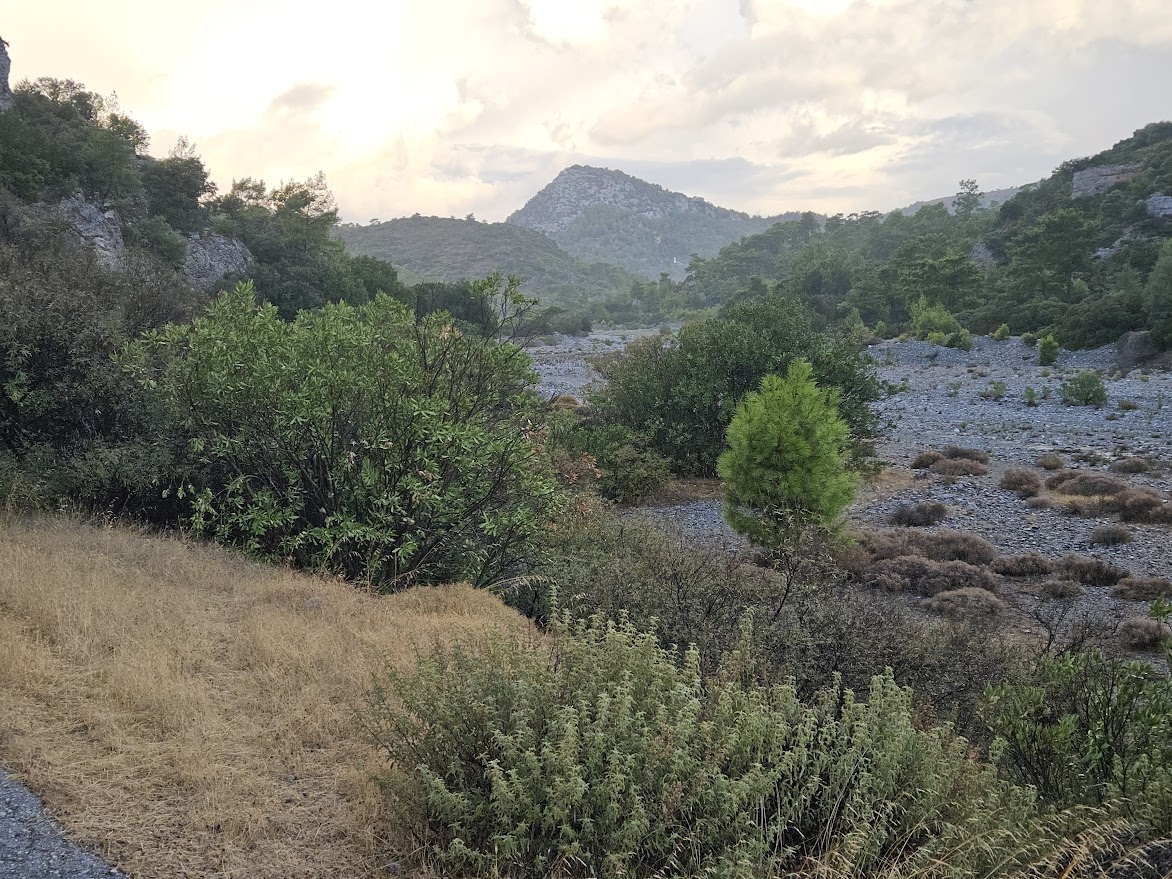 My route began on a quiet road out of Haraki towards Masari and the Rhodes-Lindos highway. I began in darkness but soon the sky had lightened and I was into Masari pretty soon, without having seen more than 1 or 2 cars. My route was allegedly road, but soon I realised that the roads of Rhodes are not what we would call roads back home. Plenty of gravel, some very driveable but some the domain of 4WD vehicles only. Heading steadily north, I was soon leaving the coastal plain and climbing towards the low hills and twisty valleys I was here to explore. The river valleys were still dry, despite the rain, but you could see where the powerful winter and spring rains had done their work, washing away the metalled road and leaving only a bed of gravel for the drivers to negotiate. There was no wading required here still, which was good news for my feet. In the distance I could see a few prominent hills and I was wondering which one would have the monastery on it - as the map showed it on a hilltop. With GPS on my phone, I just followed the track and let it take me further into the landscape.
