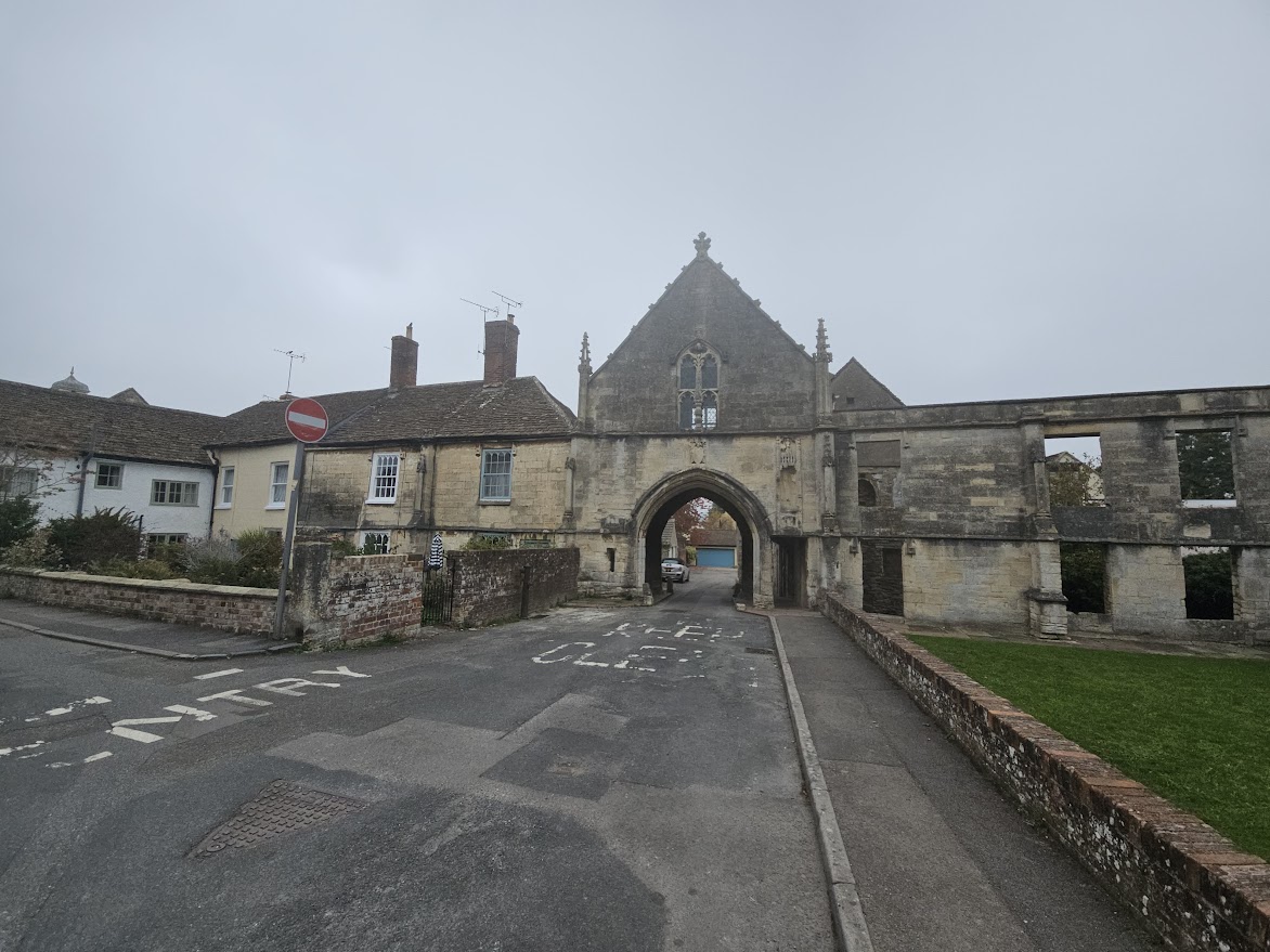 After Saul I rode east towards Stroud, aiming to swing by my daughter's new place - she texted back to confirm she was in so I had the pleasure of tea and a tour of the flat with Jel and Nerys after some googling to find the address and a knock on a neighbour's door by mistake. Fortunately he wasn't bothered as it was not super-early by now. The skies remained relentessly grey and the temperatures cool, a far cry from the hot mountain-run I'd endured in Greece a few days before. The second half of the ride was all hills - small but testing climbs came in quick succession around Uley and Dursley before the long haul south through Wickwar towards Sodbury. in Kingswood I diverted down a narrow lane to see the Abbey Gatehouse, a 14th century remnant of a long lost monastery.