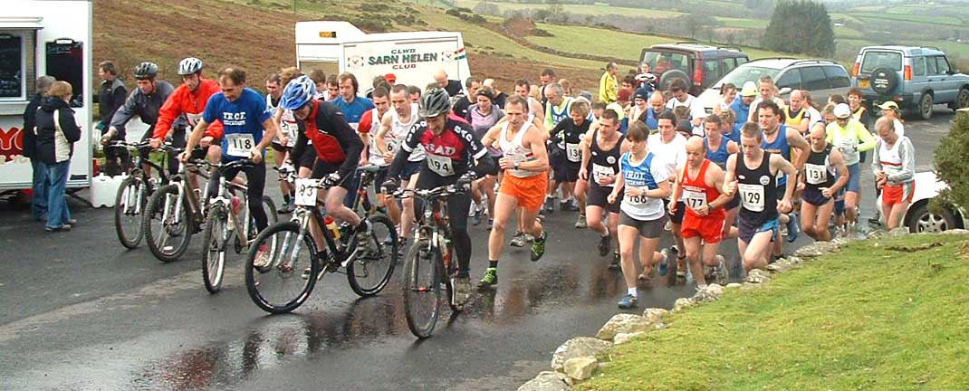 The race HQ was, and as far as I know still is, the Blaenwern Holiday Centre on a hillside near LLanybydder. Arriving from Bristol took a while! The start featured 60 or so runners as I recall plus some juniors who ran their race first and mountain bikers who joined the runners for the senior mass start. The terrain was so varied - diving down the hill on sodden trails first, then negotiating gates and styles, traversing the sapping tussock grass of The Mountain and speeding up on brief sections of road in between. It all ended with the final ascent to the finish, back at Blaenwern, wasted but happy!