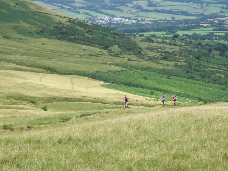 Once at Corn Du and in the grip of lung-bursting effort I managed to appreciate the beauty of my surroundings which took the edge off the pain a little (as did the word of encouragement from fellow Barry 40 runner Phil A as he passed me). On this ridge from Corn Du to it's higher neighbour Pen Y Fan you get gorgeous views both ways - the glacial valley of Cwm Lwch falls away to your left while to the right is the vast dip slope of the beacons, with the Neuadd Reservoirs mirroring the natural lake on the other side. Marshalls saw us onto the right route on both summits - the relief of finally arriving on the stony summit of Pen Y Fan was tempered a little by my first view of the way down - the marshal directed me to what looked like a cliff - the steep scarp slope of the beacons' north side, covered in super-slippery freshly rain-soaked heather. I had to slow down to stay on my feet - even then I had a couple of slips and slides - everyone seemed to be at it though so I didn't feel too bad. It was an attritional descent for the quads and ankles, and I rubbed a layer of skin clean off one heel, though it didn't bother me at the time (only later, after crossing the line, did the endorphins wear off leaving me limping a bit).